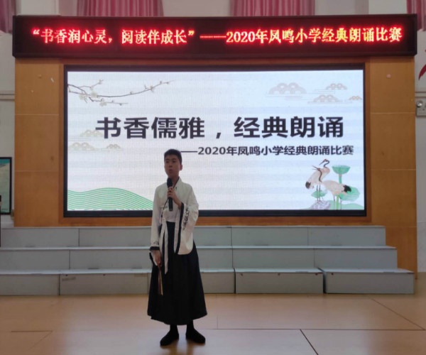 2020年9月11日,鳳鳴小學(xué)在修身學(xué)堂舉行經(jīng)典朗誦比賽。參加本次活動(dòng)的選手來(lái)自中、高年級(jí)。比賽現(xiàn)場(chǎng),同學(xué)們的表現(xiàn)可圈可點(diǎn)。在題材方面,有《生命》、《校園早晨》、《祖國(guó)啊,我親愛(ài)的祖國(guó)》、《再別康橋》、《水調(diào)歌頭》、《可愛(ài)的中國(guó)》等等,既有現(xiàn)代詩(shī)歌,又有古典詩(shī)歌,文質(zhì)兼美。在情感表現(xiàn)方面,選手們都經(jīng)過(guò)認(rèn)真準(zhǔn)備,感情真摯,他們或歌唱祖國(guó),或吟詠理想,現(xiàn)場(chǎng)高潮迭起,六(1)班潘英澤同學(xué)朗誦蘇軾《水調(diào)歌頭》,如癡如狂的樣子使觀眾深受感染;五(3)班徐晟桐同學(xué)朗誦梁?jiǎn)⒊蹲鎳?guó)啊,我親愛(ài)的祖國(guó)》,全情投入,慷概激昂,豪情萬(wàn)丈,獲得現(xiàn)場(chǎng)觀眾陣陣掌聲。選手們時(shí)而沉郁頓挫,時(shí)而低頭淺吟,他們憑借內(nèi)容豐富、表現(xiàn)力強(qiáng)、形式創(chuàng)新征服了現(xiàn)場(chǎng)評(píng)委和觀眾。