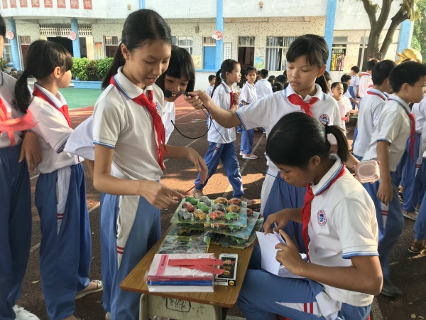 聽(tīng),鳳凰樹(shù)下的小舞臺(tái)上,一曲動(dòng)聽(tīng)的《萬(wàn)眾一心跟黨走》吸引了不少圍觀的同學(xué)們。咸水歌表演的同學(xué)們娓娓動(dòng)聽(tīng)的歌聲贏得了觀眾們的陣陣掌聲。講革命故事的同學(xué)們準(zhǔn)備充 分,《王二小》、《董存瑞舍身炸暗堡》……一個(gè)個(gè)偉大革命先烈的形象深入同學(xué)們的心中???,手工制作、書(shū)法繪畫(huà)展示的同學(xué)們也不甘示弱,一個(gè)個(gè)精美的手工作品、一幅幅惟妙惟肖的畫(huà)在同學(xué)們的手下誕生。人氣最旺的要數(shù)猜謎語(yǔ)活動(dòng)了,同學(xué)們有的三三兩兩聚在一起,絞盡腦汁地想著答案;有的時(shí)不時(shí)交頭接耳,想從同伴的身上找到靈感;有的已經(jīng)猜出謎底了,正排著長(zhǎng)長(zhǎng)的隊(duì)伍準(zhǔn)備兌換獎(jiǎng)品。校園上空回蕩著同學(xué)們的歡聲笑語(yǔ),好一片歡樂(lè)祥和的景象!