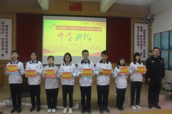 開學(xué)典禮的最后一項(xiàng),是進(jìn)行頒獎典禮。表彰在2018-2019學(xué)年第一學(xué)期期末考試中取得優(yōu)異成績的同學(xué)們。胡松華校長、歐發(fā)貴副校長、胡發(fā)良副校長、法制副校長東鳳鎮(zhèn)公安分局唐小飛大隊(duì)長,家委會代表家委會會長黃樹輝先生分別為獲得學(xué)習(xí)標(biāo)兵、學(xué)習(xí)優(yōu)秀、單科狀元的學(xué)生頒發(fā)證書。