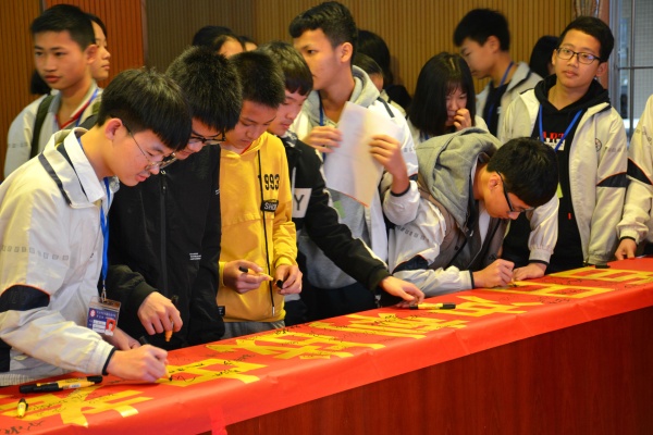 最后,全體師生有序的來到主席臺(tái)前,用手中的筆,在早已準(zhǔn)備好的“百日沖刺戰(zhàn)中考,一鼓作氣創(chuàng)輝煌”的橫幅上鄭重地簽下自己的名字或祝福語,傾注了師生們必勝的信念。