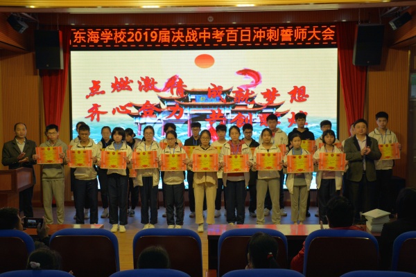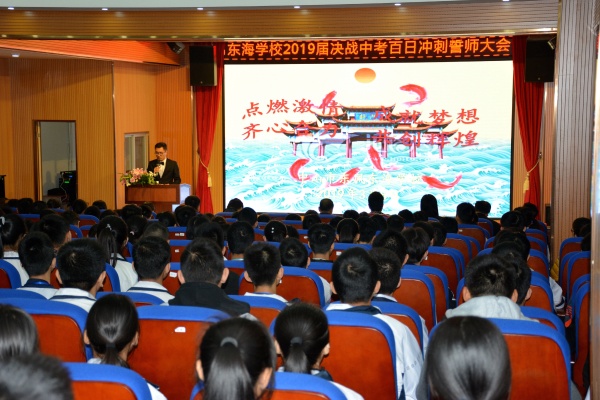 中考百日在即,為了讓初三畢業(yè)班全體師生以飽滿的熱情、昂揚(yáng)的斗志,凝心聚力,充分發(fā)揮這一百天的備考功效。3月8日上午,借農(nóng)歷二月二龍?zhí)ь^的美好寓意,東海學(xué)校在多媒體室隆重舉行2019屆決戰(zhàn)中考百日沖刺誓師大會(huì)。 王強(qiáng)校長、政教處李子榮主任、教務(wù)處呂萬春副主任、齊勉達(dá)副主任、余磊助理、吳雪超助理及初三全體師生參加了此次誓師大會(huì)。大會(huì)由政教處程玉濤助理主持。