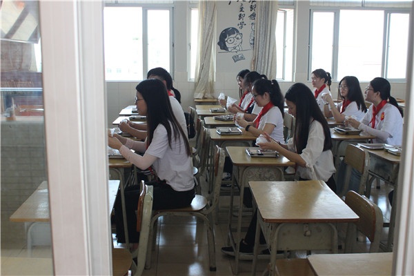 第四個(gè)場(chǎng)景是學(xué)生午餐就餐演練。模擬順序?yàn)椤捌卟较词址ān室就座—間隔領(lǐng)餐—正確摘放口罩—就餐—戴回口罩”,期間保持一米間隔距離及避免交談,如果出現(xiàn)打噴嚏或者咳嗽,用手肘遮面或紙巾捂住口鼻以防感染。