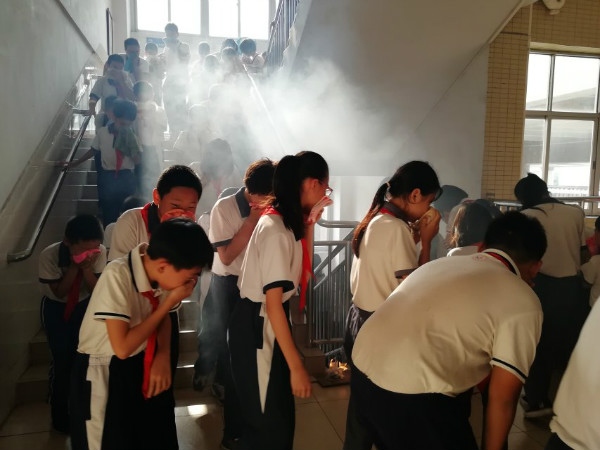 早上8:00,緊急疏散安全演練活動正式開始。隨著一陣急促的警報聲響起,各班教師按照演練方案的布置,指導(dǎo)學(xué)生們用毛巾捂住口鼻,扶著墻壁、沿著樓梯間的消防安全指示標(biāo)志彎腰半蹲迅速前行。在教師引導(dǎo)下,學(xué)生不推不擠、沉著冷靜、快速有序地從教學(xué)樓撤離。經(jīng)過5分鐘左右的緊急疏散,全校師生全部安全疏散到學(xué)校大操場和籃球場。