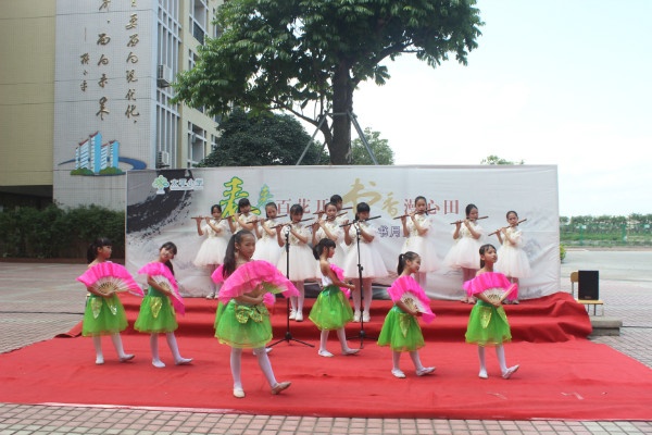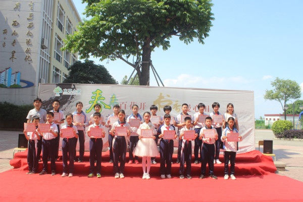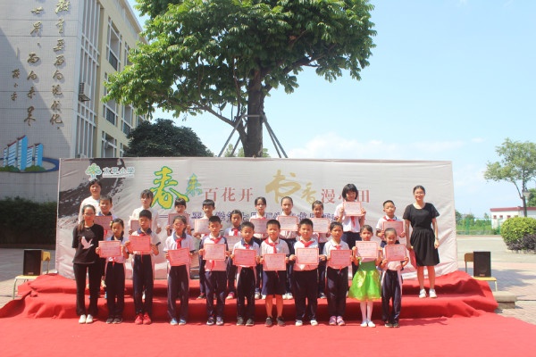 孩子們的竹笛表演熱場之后,梁巧老師便依次宣讀了“閱讀之星”“優(yōu)秀編輯小組”“書簽制作能手”“優(yōu)秀小作家”“六大書香班級”“十佳書香家庭”等一系列的獎項并進行頒獎。緊接著由獲得“十佳書香家庭”的家長代表進行讀書月活動感想發(fā)言。隨后由四(2)班的學生給全場帶來了精彩的國學經(jīng)典吟誦。