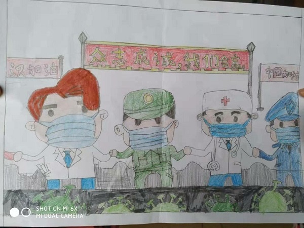 活動信息一發(fā)出,孩子們一如既往地積極配合做好相應(yīng)任務(wù)。據(jù)班主任反映,從23日起就陸陸續(xù)續(xù)收到了孩子們的海報作品??梢姾⒆觽兊母邼q熱情。收集起來的海報設(shè)計形式多樣,有線條畫的,有水彩畫的,還有簡筆畫的,有些混合有文字以表達自己強烈內(nèi)心感受的等等。從孩子的作品內(nèi)容中可以看到,那點點水墨,那一筆一畫,都是他們用心用情專注完成的。從中,大家也能感受到孩子們盼望祖國盡早走出疫情陰霾的急切心情,更能夠看出孩子們作為祖國的一員的責任心——祖國有需要,自己就要出一份力的高度責任感。