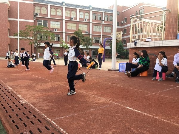 隨著拔河比賽的落下帷幕,緊接著舉行的是27日下午的跳繩比賽,跳繩比賽可謂是讓觀眾們應(yīng)接不暇的一個(gè)項(xiàng)目。每班的參賽選手們一起上場(chǎng)站成一列,裁判老師的哨聲一響,參賽的同學(xué)們同時(shí)開(kāi)始跳繩。繩子在快速轉(zhuǎn)動(dòng),啦啦隊(duì)在大聲地為本班的選手加油。一分鐘時(shí)間很快過(guò)去了,這一輪比賽結(jié)束,在這項(xiàng)持續(xù)時(shí)間短但耗體力強(qiáng)的比賽中,同學(xué)們的臉上雖然有疲累的神態(tài),但更多的是完成比賽的喜悅感,畢竟在比賽中,參與更重要!