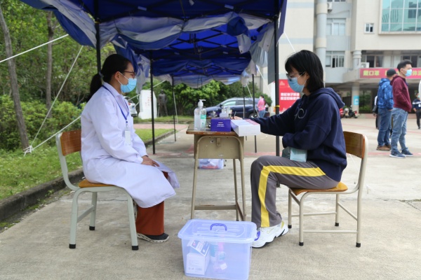 首先是組織初三級全體學生回校進行核酸檢測。為進一步鞏固新冠肺炎疫情防控成果,切實維護廣大師生員工生命安全和身體健康,全力保障春季開學工作平穩(wěn)有序,為復學提前做好準備。按照上級文件要求,東升中學24日早上8:00分時分批開展初三學生新冠病毒核酸檢測工作。(校內行政人員、初三級教職員工和后勤人員的核酸檢測采樣工作已于4月17日完成。)東升中學吳耀光校長說:“對本次涉及初三年級返崗返校教職員工和學生,我們做到‘應檢盡檢’,為師生們的生命安全和身體健康筑牢防線。”在東升中學現場,學生根據學校通知的時間準時到校門口等候區(qū),接受測溫后進入校園,依次到采樣點領取條形碼和采集管,等待采樣點“叫號”,每位同學排隊間隔保持1.5米以上。采樣現場設置了4個采樣組,每個組有兩名東升中學的教師協(xié)助登記信息和派發(fā)采集管,還有兩名“全副武裝”的醫(yī)護人員。完成采樣后,學生按指引路線有序迅速離開校園。
