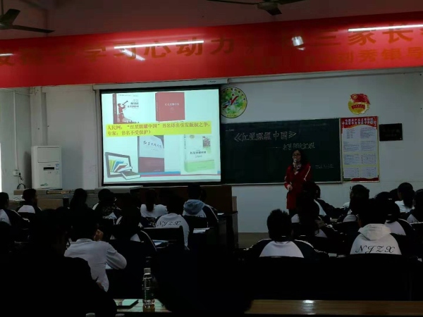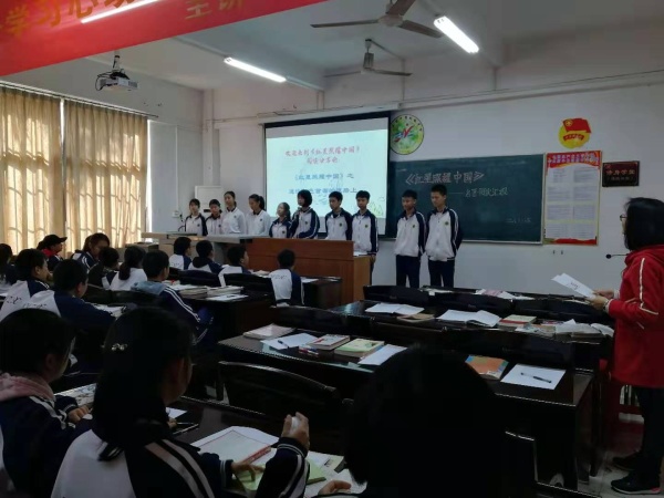 教研活動(dòng)首先由牛角中學(xué)易曉軍老師執(zhí)教《紅星照耀中國(guó)》名著閱讀課。經(jīng)過(guò)充分的準(zhǔn)備,在學(xué)生深入閱讀的基礎(chǔ)上,易曉軍老師創(chuàng)造性地為我們呈現(xiàn)了一堂以學(xué)生為主體的名著閱讀匯報(bào)課。易老師緊緊抓住“將厚的書都薄,將薄的書讀厚”的理念,通過(guò)專題分類,巧妙地引導(dǎo)學(xué)生將看似枯燥無(wú)味的內(nèi)容,有條理,有趣味地運(yùn)用小組合作共讀的方式去閱讀下來(lái),并通過(guò)各具特色的方式,如情景劇、演講等進(jìn)行小組的閱讀匯報(bào)。在整個(gè)過(guò)程中,學(xué)生表現(xiàn)出強(qiáng)烈的積極性,獲得滿滿的參與感,將一開(kāi)始內(nèi)心恐懼、看不懂的內(nèi)容,一步一步變得可以接受,甚至有了濃厚的興趣。名著閱讀這塊“難啃的石頭”也慢慢成為學(xué)生成長(zhǎng)的墊腳石。