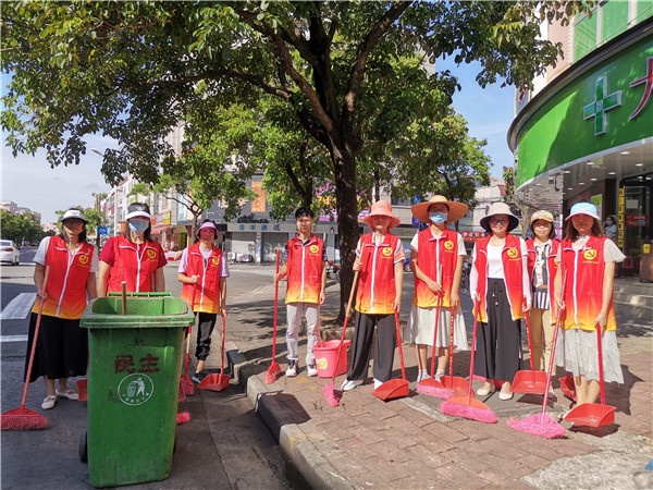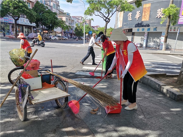 黨員志愿者及教師服務隊早早就集中到學校門口,對附近的街道進行大清掃,清理地面、清理雜物和垃圾,徹底清理衛(wèi)生死角。他們一手拿著掃把、一手拿著垃圾鏟等勞動工具,分工合作,頂著烈日,埋頭干起來。