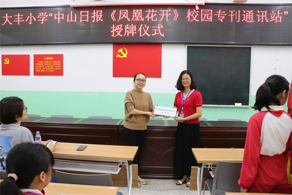 在儀式中,中山日報《鳳凰花開》校園??骶廃S漢英致辭,她向同學們介紹了成立小記者站的目的和意義,同時希望小記者們用眼睛觀察事物、用筆記錄見聞,從小記者的角度去認識和記錄世界,也期待小記者們能走出校園、走進社會,在實踐活動中鍛煉自己的膽識與勇氣,用自己獨特的視角,發(fā)現(xiàn)一切值得記錄的精彩瞬間。接著,中山報業(yè)傳媒股份有限公司教育工作室總監(jiān)羅展新女士向學校蘇少麗校長授牌,蘇校長表示,今后將充分發(fā)揮小記者站這一平臺的作用,激發(fā)學生寫作的興趣,她希望同學們在活動中能做到勤于觀察、善于思考,增長見聞,增強社會責任感。