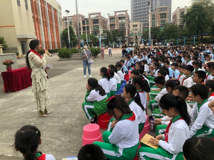 上午10:10,伴著一陣陣熱烈的掌聲,著名兒童文學作家郁雨君老師來啦!語文科組副組長楊秋云老師主持活動并詳細介紹了郁雨君老師的優(yōu)秀作品。少先隊員代表為郁老師佩戴紅領(lǐng)巾,向辮子姐姐獻上最崇高的隊禮。