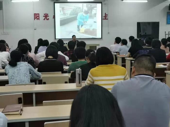 緊接著是諾如病毒的應(yīng)急處置演練。諾如病毒可以通過身體接觸、水源、食物、呼吸等途徑傳播。多為集體發(fā)病,學(xué)校是人群密集場所尤其容易群發(fā)。了解完諾如病毒的常見癥狀后,梁偉佳主任親自為全體班主任演示處理嘔吐物的步驟,學(xué)習(xí)相關(guān)的預(yù)防措施,若發(fā)現(xiàn)學(xué)生有頭暈,嘔吐現(xiàn)象,教師在處理時要戴好口罩、手套,穿好防護(hù)服,并將醫(yī)用袋里的消毒粉倒于嘔吐物上,徹底消毒后才能清理。