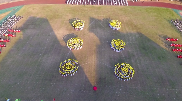 臺下同學(xué)們用如潮的掌聲詮釋他們必將不負(fù)期望的決心。掌聲平息,音樂又響起,是同學(xué)們精心排練的團(tuán)體操。一二年級的同學(xué)站成方陣,隨著“送給你小心心,送你花一朵”的歌聲,向主席臺比心,引得在場觀眾紛紛舉起手機(jī)拍攝。三四年級則是舉起絹扇,舞動出層層赤浪,變換陣型擺出“中山”“華附”“17”等字形,隊形整肅,效果卓群。五六年級緊隨其后,排列出五角星,展示自己一顆赤子之心。