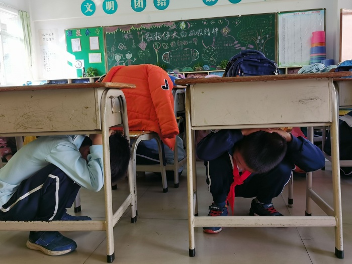 上午9:00,隨著第一聲警報(bào)的響起,全校師生迅速進(jìn)入應(yīng)急狀態(tài)。任課老師帶領(lǐng)學(xué)生就近蹲于課桌下面,蜷曲身體護(hù)住頭部,想辦法保護(hù)自己的身體。等聽到第二次警報(bào)聲響起,同學(xué)們在任課老師和安全崗老師的引導(dǎo)下,彎著腰,有序、快速地撤離教室,按預(yù)案規(guī)定的疏散路線撤離到學(xué)校操場。整個(gè)演練過程中老師和同學(xué)們臨危不亂,組織有序,逃生時(shí)沒有發(fā)生擁擠、踩踏和碰傷學(xué)生的事故。