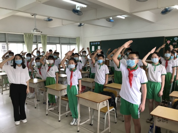上午10:40,國旗伴隨著響亮的國歌聲徐徐升起。為了避免學(xué)生扎堆聚集,學(xué)校只安排了兩個班的孩子和行政一起在操場上舉行升旗儀式,其他同學(xué)都在教室里進行。雖不在升旗現(xiàn)場,但孩子們用自己熾熱的目光注視著教室正前方的國旗,雄壯的國歌、筆直的身姿、標(biāo)準(zhǔn)的隊禮,無一不彰顯孩子們對祖國的熱愛和對校園的想念。