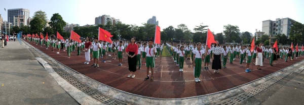 上午,伴隨著雄壯豪邁的國歌聲,鮮艷的五星紅旗冉冉升起,全體師生向國旗敬禮,活動(dòng)正式開始。林穎老師作國旗下的講話,教育引導(dǎo)少先隊(duì)員們愛自己、愛學(xué)校、愛祖國。林穎老師告訴隊(duì)員們,紅領(lǐng)巾是少先隊(duì)員的標(biāo)志,我們應(yīng)該要正確佩戴好紅領(lǐng)巾,愛護(hù)好紅領(lǐng)巾。緊接著,大隊(duì)輔導(dǎo)員陳詠詩老師在全體隊(duì)員中廣泛開展少先隊(duì)的禮儀、少先隊(duì)歷史教育。陳老師向全體隊(duì)員介紹了少先隊(duì)組織的標(biāo)志——隊(duì)旗。少先隊(duì)的隊(duì)旗是由五角星和火炬組成的,五角星表示中國共產(chǎn)黨的領(lǐng)導(dǎo),而火炬象征著勝利。隨后,陳老師讓二至六年級(jí)的少先隊(duì)員們重溫當(dāng)時(shí)入隊(duì)的誓詞。隊(duì)員們高舉起小小的右拳,在大隊(duì)輔導(dǎo)員的領(lǐng)誓下,堅(jiān)定地說出入隊(duì)誓詞。最后,全體隊(duì)員們精神飽滿,意氣風(fēng)發(fā),以飽滿的熱情高唱《中國少年先鋒隊(duì)隊(duì)歌》,唱出了對黨和少先隊(duì)組織的熱愛。
