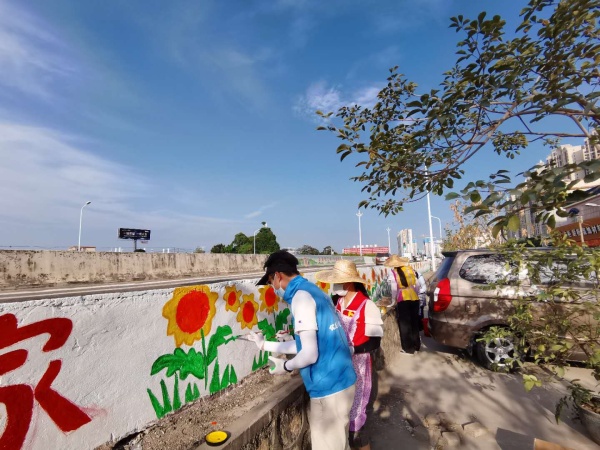 30日下午,在群眾社區(qū)工作人員的帶領(lǐng)下,群眾小學(xué)的教師黨員及教師志愿者們前往港口高速出口橋頭,通過繪畫的方式為它提升“顏值”。老師們在繪畫的過程中認(rèn)真嚴(yán)謹(jǐn),一絲不茍,即使他們的額頭上布滿了汗水,手上也沾上了許多染料,但他們既不怕苦、也不怕累,力求細(xì)心地勾勒出每一根線條,涂好每一塊顏色。