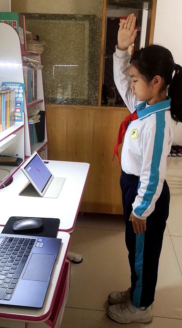 清晨,石特小學(xué)的國旗就下到了旗桿的三分之一,以此悼念那些犧牲的抗疫英雄,為他們祈福!與此同時(shí),同學(xué)們觀看了天安門廣場(chǎng)舉行的下半旗儀式,國歌響起,屏幕前的同學(xué)們肅然起敬,向著國旗立正,望著國旗敬禮,接著,目送國旗緩緩降下,此時(shí)此刻,同學(xué)們胸前的紅領(lǐng)巾顯得格外鮮艷!