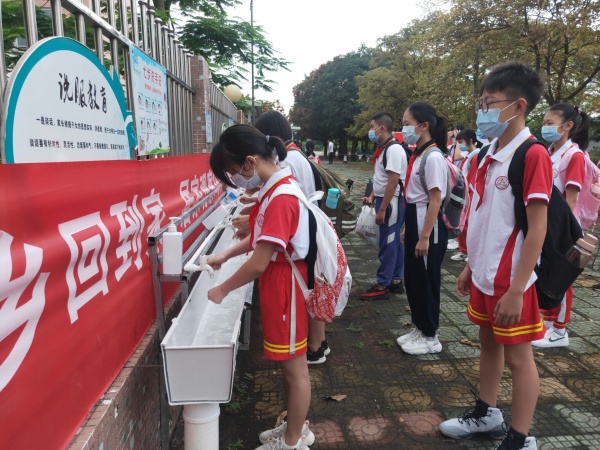 開學當天,根據(jù)學校統(tǒng)一安排,四至六年級學生分批錯時入校。學校全體教職工上午7:00前全部到崗到位,校門口復學準備工作一切就緒。學生入校的過程井然有序,校門未出現(xiàn)交通擁堵現(xiàn)象。8點左右,孩子們陸續(xù)進入校門,戴著口罩也難掩內心的激動和喜悅。進入通道后,學生在值班老師的指引下,間隔1米列隊,依次有序通過入校前洗手、消毒、體溫監(jiān)測等一系列步驟后,體溫正常,方可入校。在現(xiàn)場,交通警察和公安維持入校秩序,通力合作做好復學返校工作。