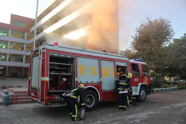 這時(shí),伴著警笛聲,港口消防專職隊(duì)出動(dòng)三臺(tái)消防車、18名指戰(zhàn)員到達(dá)火災(zāi)現(xiàn)場(chǎng),并立即開展火災(zāi)搶救工作。根據(jù)現(xiàn)場(chǎng)火勢(shì)情況,堅(jiān)持救人第一指導(dǎo)思想,決定采取內(nèi)外夾攻、重點(diǎn)突破的滅火戰(zhàn)術(shù),迅速部署戰(zhàn)斗力量對(duì)著火的部位進(jìn)行射水滅火并搶救被困人員。滯留在教室的傷員被解救出來,學(xué)校衛(wèi)生員馬上對(duì)傷員進(jìn)行了急救和傷口包扎。整個(gè)消防演練過程緊張有序,實(shí)用性強(qiáng),收到了預(yù)期的效果。