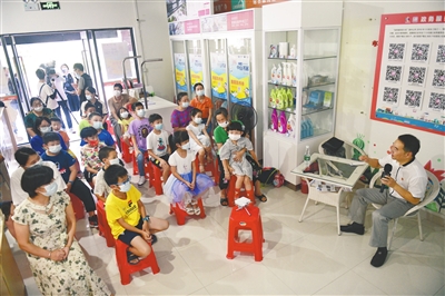 聽說小區(qū)服務(wù)站將會舉辦主題宣講活動,朱端陽早早就帶著7歲的外孫女郭錦若前來“搶占前排”。“我們從小就給孩子講一些名著故事,同時給她看一些簡短的偉人故事,希望她能學(xué)習(xí)偉人身上的優(yōu)秀品質(zhì),同時幫助她樹立愛黨、愛國的意識”。朱端陽說,書展結(jié)合黨史故事宣傳進小區(qū)的模式,在培育和激發(fā)孩子們愛黨、愛國情懷的同時,也能讓孩子們明白當(dāng)今的幸福生活來之不易,希望平時也能多舉辦一些這樣有意義的活動。