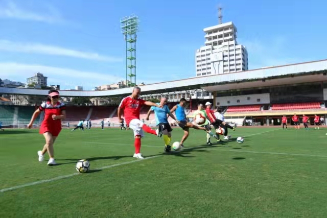 跑步活動結(jié)束后,廣東省教育廳工會、廣州美術(shù)學(xué)院工會、廣東援疆工作隊(duì)、駐粵部隊(duì)共4支足球隊(duì)開展了軍地足球交流活動,共有近百名足球愛好者參加了交流,一起健康運(yùn)動為祖國慶生。