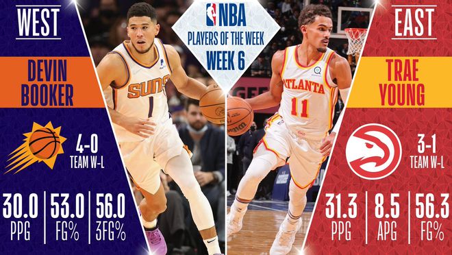 NBA官方宣布,憑借過去一周的出色表現(xiàn),亞特蘭大老鷹隊(duì)的楊和菲尼克斯太陽(yáng)隊(duì)的布克被評(píng)為東西部第6周的周最佳球員(當(dāng)?shù)貢r(shí)間11月22日~28日)。