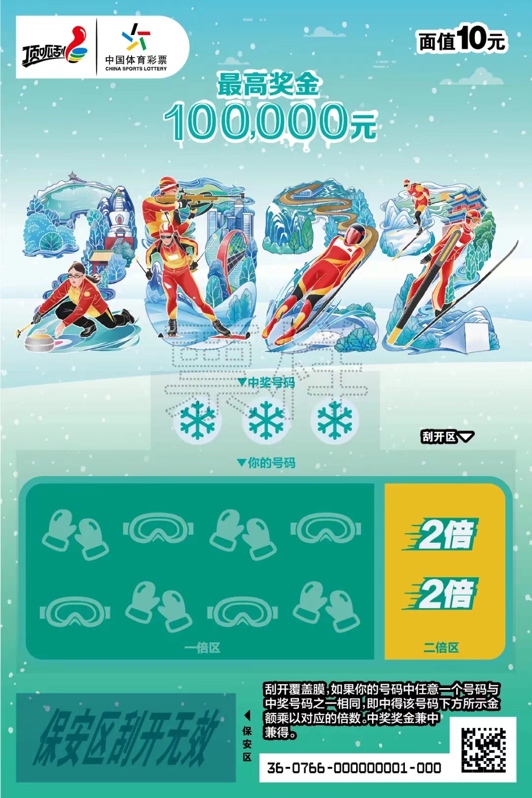 此前我們已經(jīng)介紹過(guò)體彩虎年生肖票了,而2022北京冬奧會(huì)是中國(guó)體育的第一盛宴,“2022”主題票面通過(guò)數(shù)字2022展現(xiàn)出中國(guó)體育健兒在冰雪運(yùn)動(dòng)中英姿颯爽,也號(hào)召大家喜迎北京冬奧、為中國(guó)體育加油。“2022”面值10元,游戲玩法為數(shù)字匹配,共有10次中獎(jiǎng)機(jī)會(huì),最高獎(jiǎng)金10萬(wàn)元。