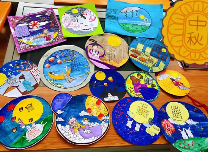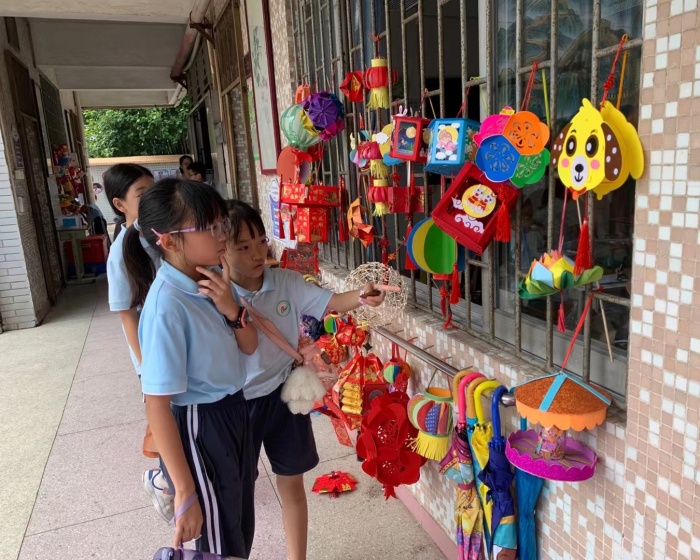 看,校園里張燈結彩,各式各樣的燈籠精彩紛呈,一片喜氣洋洋。有惟妙惟肖的動物燈、紅紅火火的花燈,古色古香的水墨畫燈、色彩繽紛的繡球燈,甚至還有新年紅包做成的紅包等。除了制作燈籠,大涌南文小學的學生們還繪制了一大批色彩明艷、趣味十足的詩配畫作品。繪畫過程中,同學們暢談有關中秋的習俗,把與中秋節(jié)相關的古詩結合著繪畫融入到一張張生動的“詩配畫”中,讓大家一起了解嫦娥奔月,吳剛伐桂,玉兔搗藥等傳統(tǒng)佳話。同學們一起觀賞著眾人的佳作,時而雀躍,時而輕嘆,不時傳出陣陣歡呼和掌聲。
