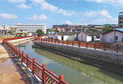 基尾涌兩岸紅色的護(hù)欄在秋日陽光照耀下格外醒目,水面寬闊波光粼粼,新砌的河堤擋墻整齊劃一。