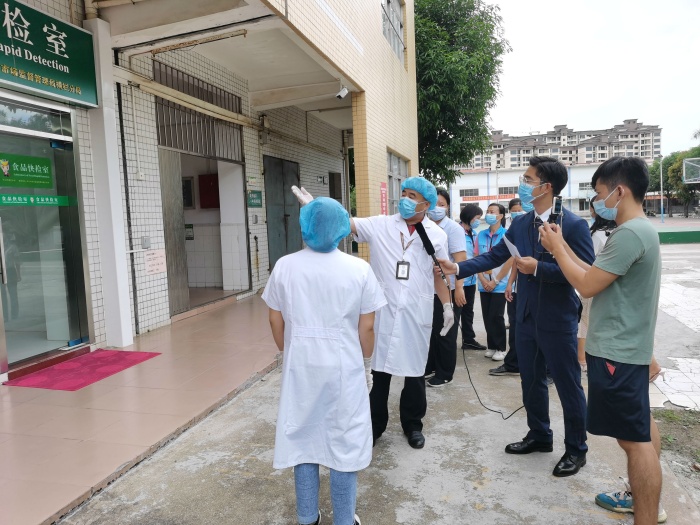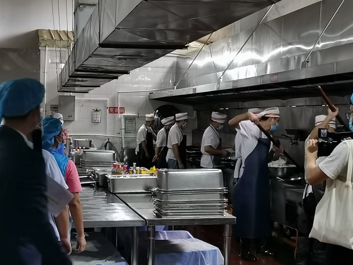 在網(wǎng)絡(luò)直播鏡頭的實況直播下,檢查組一行首先來到學校的食品快檢室,對食品安全監(jiān)測設(shè)備、監(jiān)測流程、監(jiān)測記錄、食品安全公示情況等進行了詳細的檢查和實況直播。隨后,檢查組深入到學校食堂的每一處,對食堂防疫措施、食品采購、食品清洗、食品加工、食品檢測、食品衛(wèi)生、食材的存儲和來源、餐具消毒、大米質(zhì)量、菜品種類等情況進行了詳細地檢查,視頻攝制組也對現(xiàn)場的情況進行了實況直播。