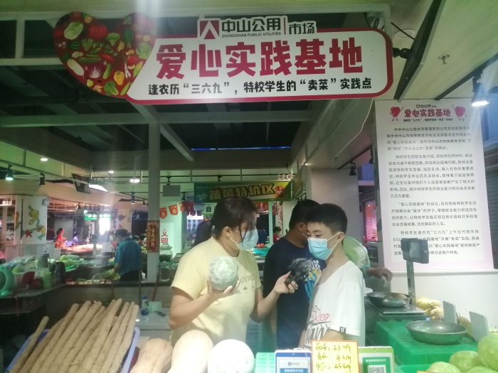 近期,竹苑市場一個普通的菜檔口受到了媒體和廣大市民的關注,因為菜檔口的工作人員是來自中山市特殊教育學校培高年級的學生和畢業(yè)生們。每逢農(nóng)歷“三六九”上午,不管是工作日還是放假休息日,不管是烈日當空還是狂風暴雨,學校的黨員教師都會準時帶學生到竹苑市場D31檔口開展實踐活動。他們熱情有禮地跟顧客打招呼、了解顧客需求,稱重收錢,整理菜品,忙得不亦樂乎,得到了市民群眾的好評。