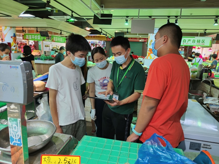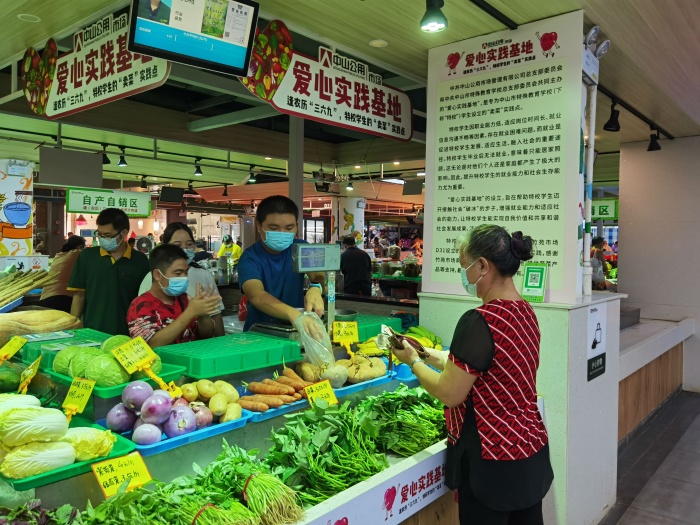 從畏縮到勇敢,從生疏到嫻熟,學生們在一步步成長,顧客們看著他們熟練規(guī)范的操作紛紛豎起大拇指。竹苑市場場長孔德賢對這群孩子們的勞動品質和學習能力也是贊不絕口:“一開始有點害羞,經(jīng)過一段時間的學習和鍛煉后,他們?nèi)缃褚疡{輕就熟、勝任工作。”一位前來買菜的阿姨接受記者采訪時,表示對孩子們的表現(xiàn)十分滿意:“如果不是這個宣傳板在這里,我真看不出他們有什么不一樣?!?/p>