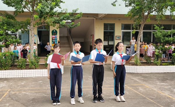 八點(diǎn)整,升國(guó)旗儀式正式開始。國(guó)旗護(hù)衛(wèi)隊(duì)邁著堅(jiān)定的步伐走向升旗臺(tái)。鮮艷的五星紅旗在激昂雄壯的國(guó)歌聲中冉冉升起、迎風(fēng)飄揚(yáng),全體師生肅立注目,齊唱國(guó)歌。國(guó)旗下,教務(wù)處主任吳偉卿激勵(lì)每一位學(xué)生要感恩國(guó)家的付出,好好學(xué)習(xí),豐富知識(shí),增長(zhǎng)才干,長(zhǎng)大后把祖國(guó)建設(shè)得更加強(qiáng)大。接著,六(1)班的四位同學(xué)以激情澎湃的詩(shī)朗誦《強(qiáng)國(guó)力量》向偉大的祖國(guó)致敬。他們把文字蘊(yùn)含的振奮人心、群情激昂、波瀾壯闊和自己內(nèi)心對(duì)偉大的黨和親愛的祖國(guó)的熱愛和自豪之情,展現(xiàn)得淋漓盡致,深入人心。