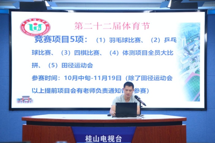金秋時(shí)節(jié),天高氣爽。10月11日清晨,中山市桂山中學(xué)利用校園電視臺(tái)直播方式舉行了主題為“錘煉品德 剛強(qiáng)不屈”的第二十二屆體育節(jié)開(kāi)幕式。團(tuán)委書(shū)記嚴(yán)玉龍主持校會(huì),全校師生在課室同步收看。