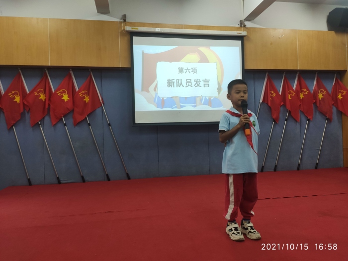 大隊(duì)輔導(dǎo)員林靜敏老師宣讀了新隊(duì)員入隊(duì)名單,并對新隊(duì)員入隊(duì)表示熱烈祝賀。在大隊(duì)輔導(dǎo)員的領(lǐng)下,在莊嚴(yán)的隊(duì)旗下,高高地舉起右手大聲宣誓,時(shí)刻準(zhǔn)備著為共產(chǎn)主義事業(yè)而奮斗!接著由新隊(duì)員代表林永輝同學(xué)和老隊(duì)員代表李文駿同學(xué)做了精彩的發(fā)言,梁廣平主任對新晉中隊(duì)授予中隊(duì)旗并頒發(fā)聘書。最后再新隊(duì)員堅(jiān)定的呼號(hào)聲中結(jié)束了本次的儀式,相信他們能在星星火炬的指引下,牢記黨的教誨,全面發(fā)展,茁壯成長。