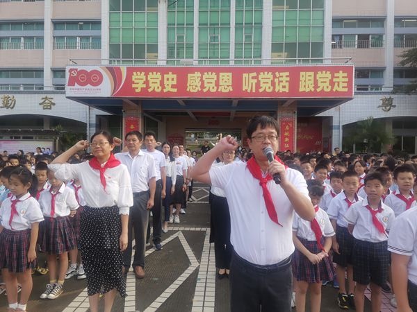 緊接著,少先隊(duì)員們高舉鮮艷的黨旗和隊(duì)旗,英姿颯爽地來到升旗禮臺(tái)前,全體隊(duì)員敬隊(duì)禮,高唱少先隊(duì)隊(duì)歌,嘹亮的歌聲立刻飄揚(yáng)在校園上空,久久回蕩。一曲結(jié)束,學(xué)校黨員教師面向鮮紅的黨旗,在華校長的帶領(lǐng)下緊握右拳,宣讀誓詞,整齊堅(jiān)定的話語深深地震撼了全體師生。大隊(duì)輔導(dǎo)員阮秀迎老師帶領(lǐng)全體少先隊(duì)員重溫入隊(duì)誓言,稚嫩真摯的童聲里飽含著深深的報(bào)國情。