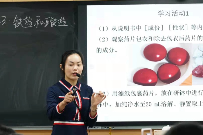 嚴(yán)華老師以補(bǔ)鐵劑硫酸亞鐵片為線索,通過一個(gè)魔術(shù)引入課堂,進(jìn)而用一則班級(jí)同學(xué)故事引出本節(jié)課內(nèi)容,引導(dǎo)同學(xué)們思考,缺鐵性貧血補(bǔ)鐵,補(bǔ)幾價(jià)的鐵,服用過程應(yīng)該注意什么?教師以實(shí)驗(yàn)分析硫酸亞鐵片成份及解析說明書為線索,融合鐵離子和亞鐵離子的檢驗(yàn)和相互轉(zhuǎn)化的知識(shí),結(jié)合生活實(shí)際,寓教于樂,充分挖掘教材,設(shè)置一系列問題,層層推進(jìn),讓學(xué)生較好地掌握化學(xué)知識(shí)的同時(shí)學(xué)習(xí)生活常識(shí)。在學(xué)生展示和表達(dá)的過程中,及時(shí)點(diǎn)撥知識(shí)點(diǎn)上的細(xì)節(jié)。教學(xué)過程師生互動(dòng)性強(qiáng),教師注重啟發(fā)引導(dǎo)學(xué)生,以飽滿的熱情感染學(xué)生,收到了良好的教學(xué)效果。