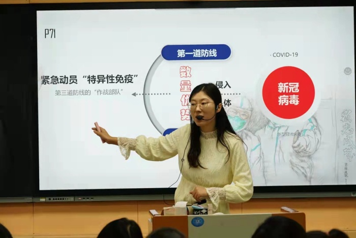 任曉虹老師利用“新冠病毒入侵”的相關(guān)情境貫穿整節(jié)課,以“新冠病毒”作為第一視角,探索其進(jìn)入人體后遇到的一系列事情,按“病毒侵入——免疫細(xì)胞的識(shí)別——免疫過程——新冠肺炎的治療與預(yù)防”為主線進(jìn)行,課堂中充分挖掘教材,結(jié)合科學(xué)史的發(fā)展路線,配合趣味視頻和手工教具引導(dǎo)學(xué)生了解體液免疫的過程,幫助學(xué)生自主構(gòu)建和完善體液免疫的模型,最后升華到利用本節(jié)所學(xué)助力政府對(duì)疫苗宣傳工作的開展,總體實(shí)現(xiàn)從微觀(身體內(nèi)部如何應(yīng)對(duì))到宏觀(人體主觀如何應(yīng)對(duì)),從個(gè)人(自己應(yīng)該如何做)到群體(我們?nèi)绾卫脗€(gè)人力量服務(wù)大眾),幫助學(xué)生抓好課堂,延伸課外,學(xué)會(huì)照顧小我,幫助大我。