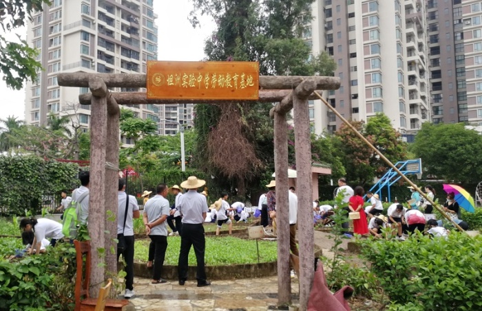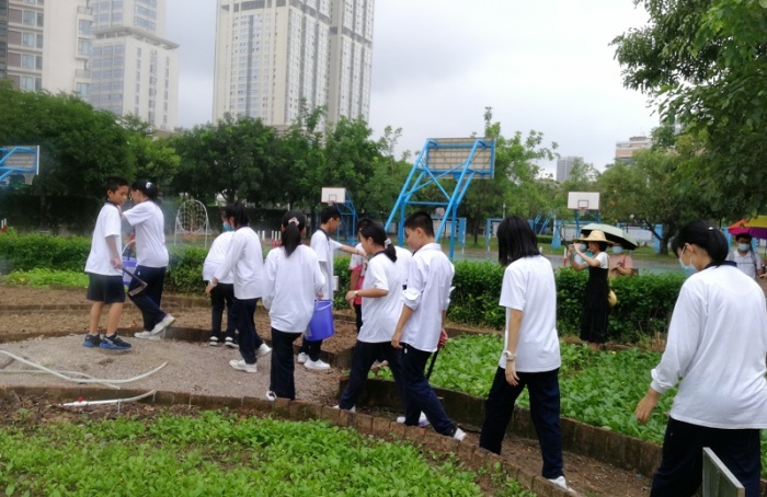坦洲實驗中學的古娜芬老師帶來了一節(jié)精彩的《菜苗的移栽》公開課。她先帶領(lǐng)學生們上了10分鐘的理論課,了解菜苗移栽的操作方法和注意事項,然后讓學生們以9人為一組自由組隊,領(lǐng)取勞動工具,進行勞動分工。學生們興高采烈地帶著工具到學校的勞動教育基地進行種菜勞動。他們有的起苗,有的挖窩,有的種菜,有的澆水,干的不亦樂乎。