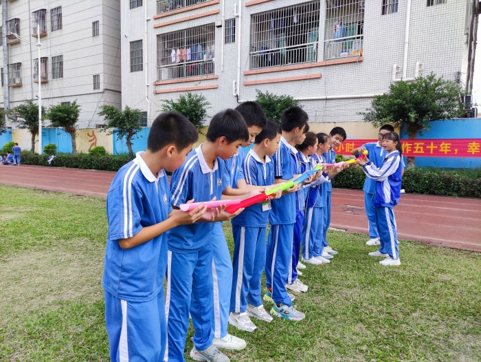 研討活動首先由課題主持人王武輝老師和課題組成員孫滔、朱四萍、陳浩芳、劉樂琴、鄭志權(quán)等五位老師圍繞“自由與規(guī)則”為主題開展德育拓展活動。他們主持的游戲分別為“桃花朵朵開”“珠行千里”“黑夜探索”。在每個游戲開展前導(dǎo)師都會詳細講解游戲規(guī)則。第一個游戲“桃花朵朵”,是一個熱身游戲,由陳浩芳老師主持。在陳老師的指導(dǎo)下,全班同學全身心投入,在操場上奔跑著、歡呼著、擁抱著,每一輪“落單”同學最后進行才藝展示,學生們的活動熱情得到激發(fā)。第二個游戲“珠行千里”,相對于第一個游戲,具有一定的難度,考驗小組同學的團結(jié)度,由鄭志權(quán)老師主持。在游戲分享環(huán)節(jié),學生們躍躍欲試,并紛紛表示規(guī)則很重要,小組同學之間一定要團結(jié)。第三個游戲“黑夜探險”,這是三個游戲中難度系數(shù)最大,由王武輝老師主持。王老師在游戲開始前,給每一個學生分發(fā)一個眼罩,只有每組隊伍最后一位同學不用戴眼罩,整個游戲過程不能發(fā)出聲音,由導(dǎo)師帶領(lǐng)穿行預(yù)定的路線。游戲進行前,小組長組織本組同學商量指令動作,游戲結(jié)束后,進行游戲感受分享,在游戲中同學們感受到了小組同學規(guī)則、默契的重要性。