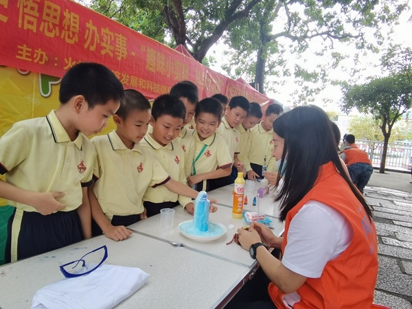 當(dāng)日下午,開發(fā)區(qū)第三小學(xué)的“鳳凰臺(tái)”熱鬧非凡,工作人員為學(xué)生設(shè)置了6個(gè)不同的小實(shí)驗(yàn)體驗(yàn)區(qū)讓學(xué)生通過實(shí)踐更清晰地了解實(shí)驗(yàn)原理的同時(shí)了解科學(xué)的魅力。在工作人員的引導(dǎo)下,學(xué)生們樂于動(dòng)手實(shí)驗(yàn),儼然是一個(gè)個(gè)小科學(xué)家,讓學(xué)生近距離地感受了科學(xué)的神奇魅力。