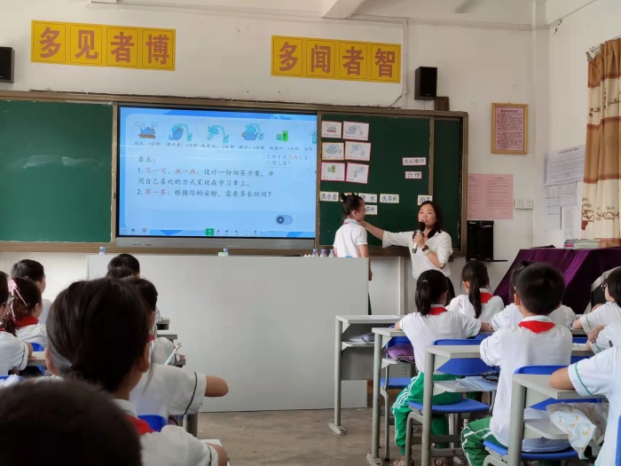 梁滿枝老師展示的是四年級數(shù)學上冊《合理安排時間》,梁老師從學生生活實際出發(fā),以微視頻引入并提出問題,圍繞著學習單讓學生獨立自主地設(shè)計沏茶方案、展示方案,老師以輕松、幽默的語言引導學生在不斷的探索、比較、思考中總結(jié)出最優(yōu)的方案,從而很好地完成教學目標,突破重難點。充分體現(xiàn)了“老師為主導,學生為主體”的教學模式,尊重學生的個性發(fā)展,得到在場老師的高度肯定和一致好評!