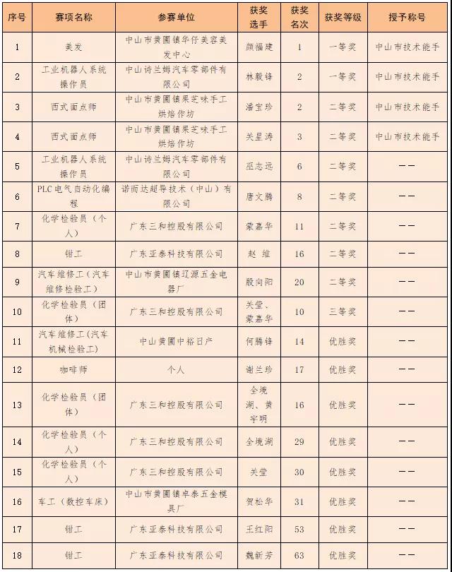 中山市第一屆職業(yè)技能大賽獲獎(jiǎng)名單(黃圃鎮(zhèn))