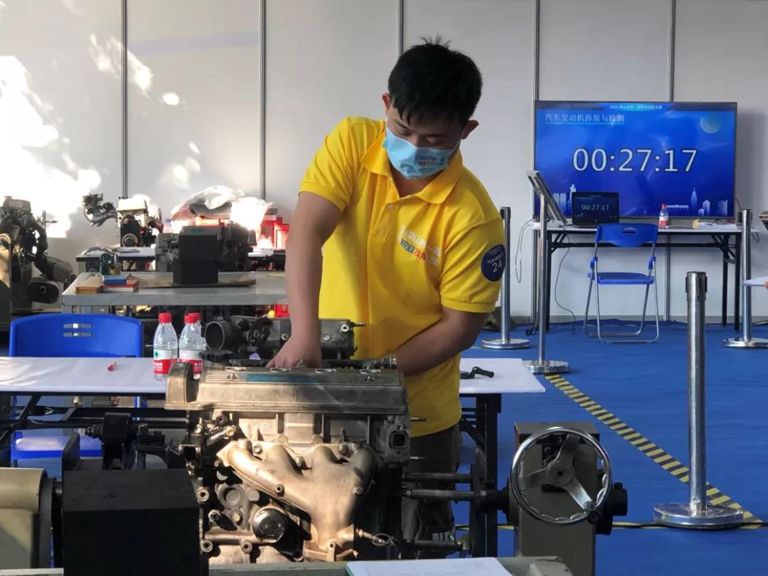 汽車維修比賽項(xiàng)目中,選手與時(shí)間賽跑,全神貫注投入比賽。