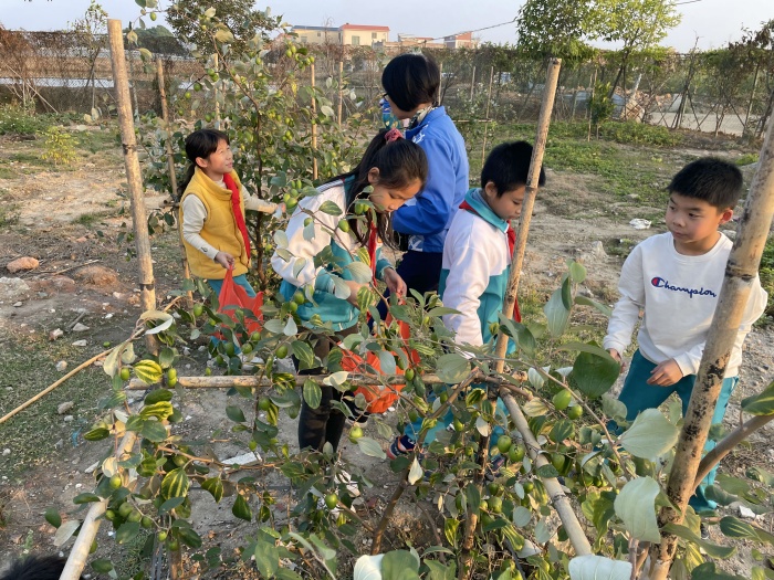 活動(dòng)前,詹前秒校長(zhǎng)和各班班主任向每位同學(xué)講述如何清理雜草、如何辨別青棗的成熟程度、如何根據(jù)成熟度來(lái)進(jìn)行正確的采摘,以及勞動(dòng)過(guò)程中的注意事項(xiàng),并且進(jìn)行了示范。認(rèn)真聽(tīng)完老師指導(dǎo)并且完成了除草任務(wù)的同學(xué)們小心翼翼走進(jìn)青棗地里仔細(xì)觀察、尋找、挑選、詢問(wèn)、研究……最后再小心采摘。就像一群勤勞的小蜜蜂,采自然地 “花”,釀“知識(shí)”的蜜。第一次嘗試從播種到豐收,孩子們興奮不已,每張小臉上都掛著驕傲與喜悅。