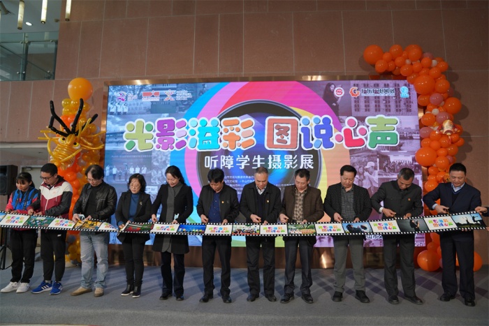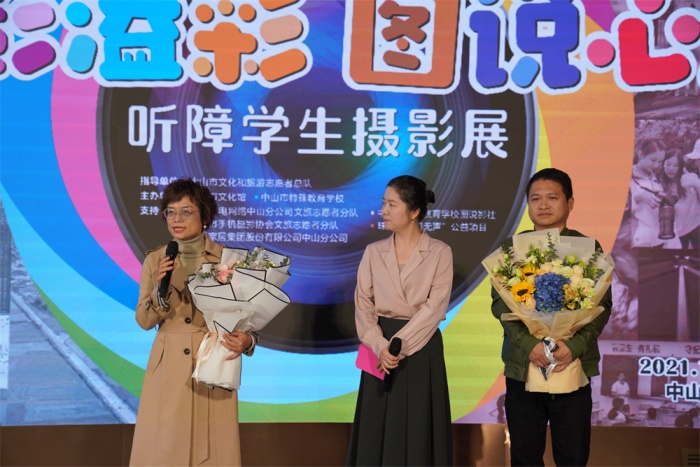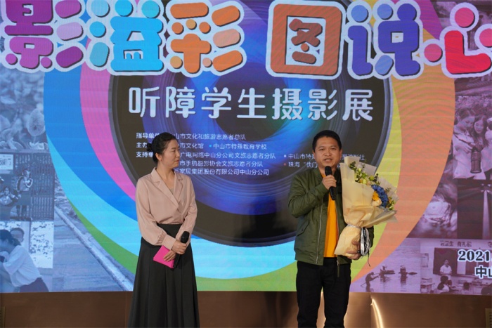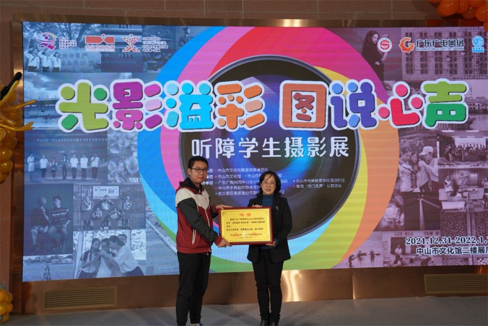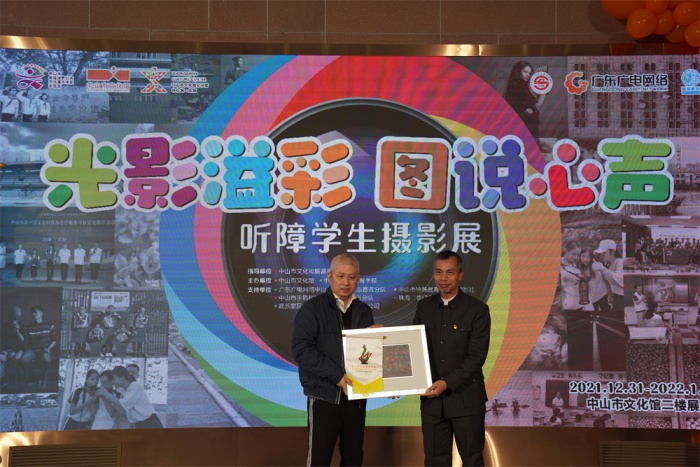 頒牌儀式上,中山市文化館為支持單位廣東廣電網絡中山市分公司授予感謝匾牌,歐派家居集團股份有限公司中山分公司為市特校捐贈課桌椅一批。隨后,引領聽障孩子入門的珠?!翱扉T無聲”公益項目創(chuàng)始人朱習女士對孩子們的成長表示驚喜和欣慰,“光影溢彩 圖說心聲”聽障學生攝影培訓項目負責人、本次攝影展主要策展人之一賀億強先生表達了自己的感謝與激動,并對聽障孩子今后攝影學習作了詳細規(guī)劃。活動中,嘉賓與學生代表共同為本次開幕式剪彩,接著嘉賓們一同步入展區(qū),靜心賞鑒聽障孩子們用眼睛“聽到”的世界,用鏡頭記錄的生活,為明媚綻放的生命之光點贊!