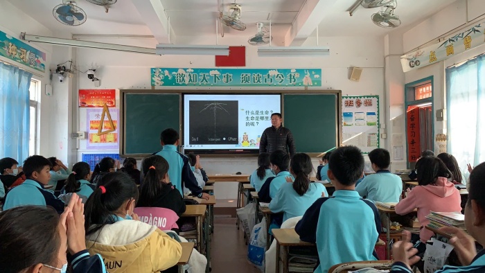 盧主任首先拋出問題“世界上什么東西最寶貴?”來引出話題“生命”,從孩子們學過的課文聊起,讓他們認識生命是神奇的偉大的。從生命的起源談起,讓他們懂得要珍愛生命、敬畏生命。通過視頻分享,引導學生感悟生命,保護自己的生命,不拿生命賭氣。盧主任還分享另外一個學校制作的視頻告訴孩子們:生活中我們會遇到各種各樣的困難,我們不僅要面對并解決還要珍愛生命,讓生命精彩地綻放!授課中,一幅幅圖片,喚醒了學生們對生命的理解;一次次互動,表達了學生們熱愛生命的心聲;一個個事例,激發(fā)了學生們直面挫折的決心。六(1)班學生認真聆聽,各抒己見,受益匪淺。