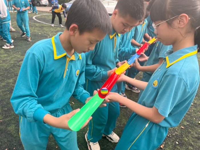 活動中,通過抽簽的形式把同學們分成4個小組,每組自行選出隊長、確定隊名和口號,隨后的“珠行萬里”環(huán)節(jié),要求同學們分組站成一排,通過共同傳遞一個圓球,讓學員感受團隊間的配合、銜接以及自我控制能力,是培養(yǎng)團隊協作能力的游戲,這項游戲考驗的是孩子們彼此接納、協同合作的能力,在愉悅的氛圍中孩子們悄悄感受溝通的重要性。