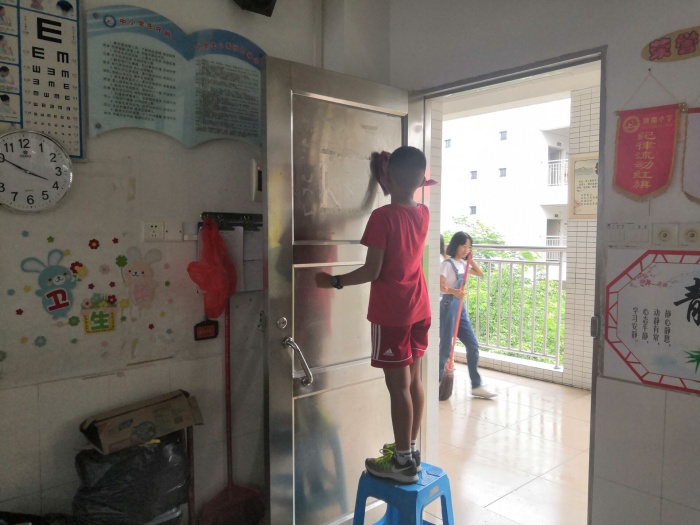 看!在老師的帶領(lǐng)、分工下,家長(zhǎng)志愿者與同學(xué)們各司其職,完成教室、功能室的打掃!